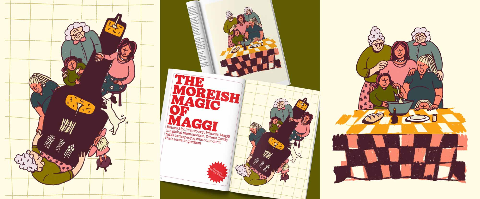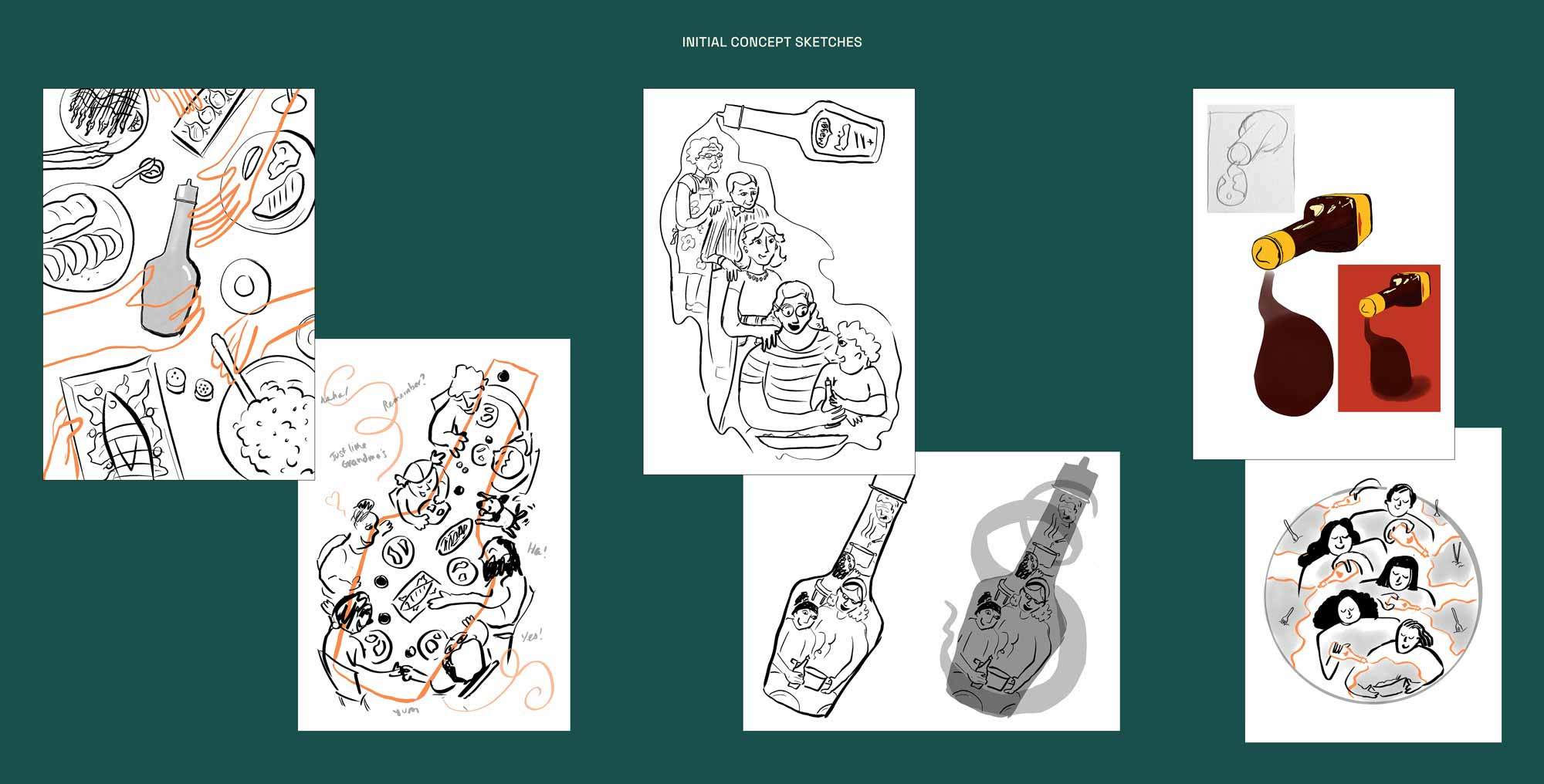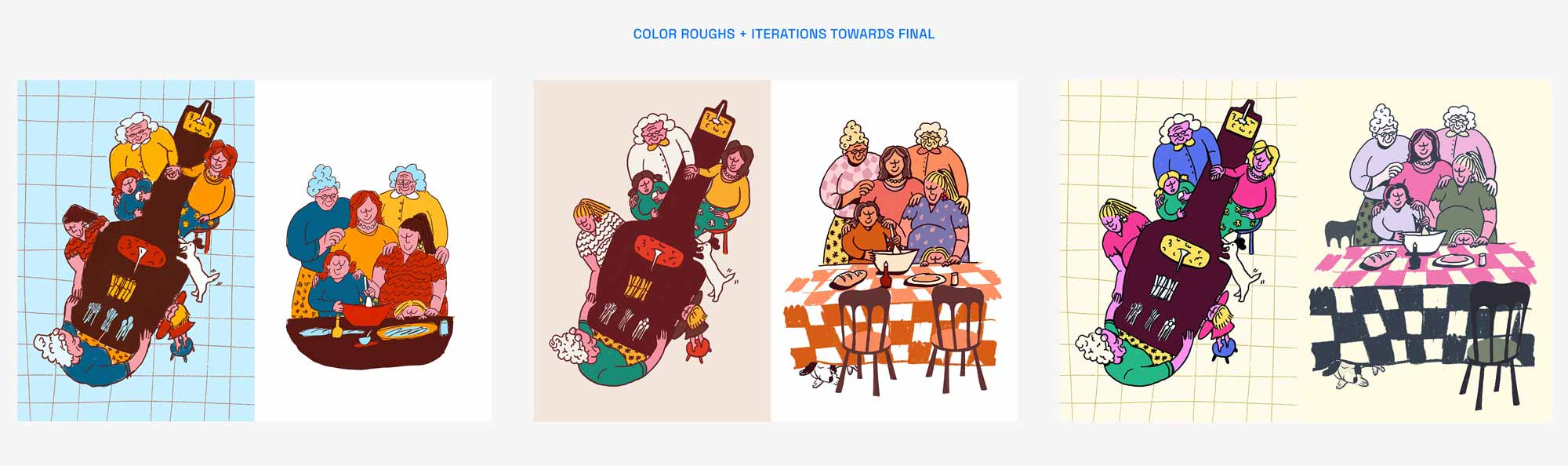 I love seeing your process! So many good sketches that I couldn’t guess which one you went with for the final but was delighted with each one! My favorite has to be the family around the maggi bottle :)