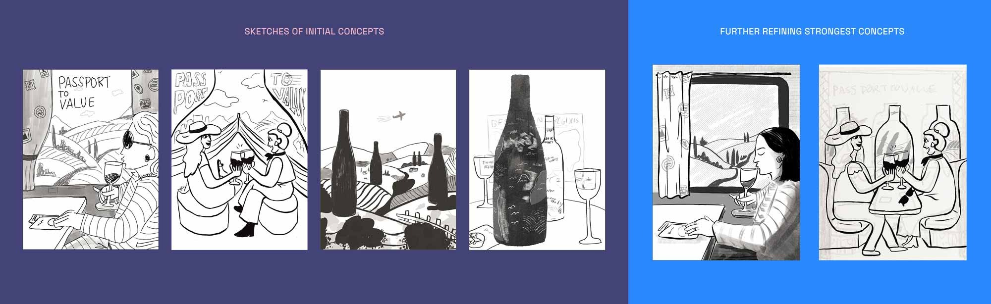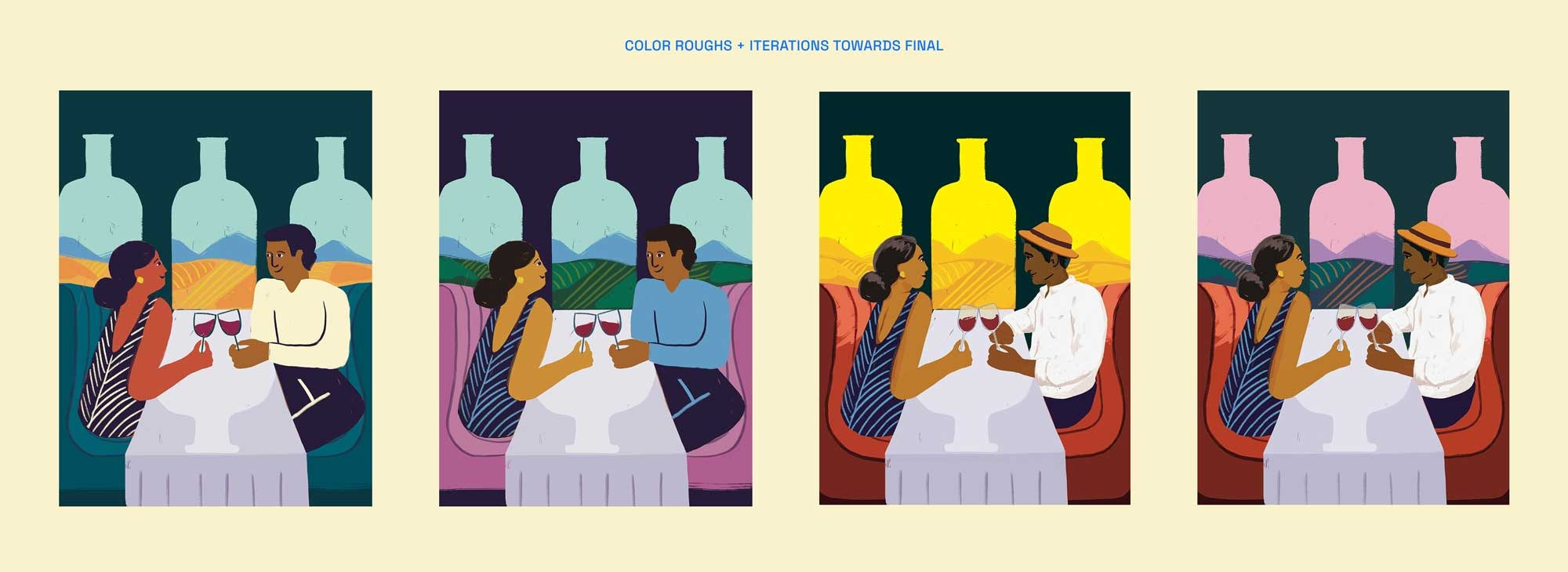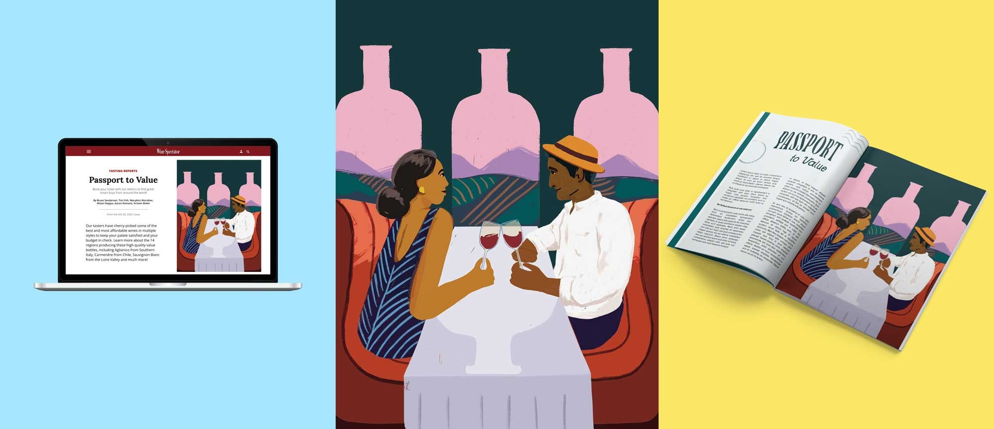 Illustrator Molly McCammon provided this brief based on her own previous assignment from Wine Spectator – a full page illustration accompanying an article about discerning luxe wines from places like Chile, Italy, and France, without having to actually shell out the bucks to travel there.