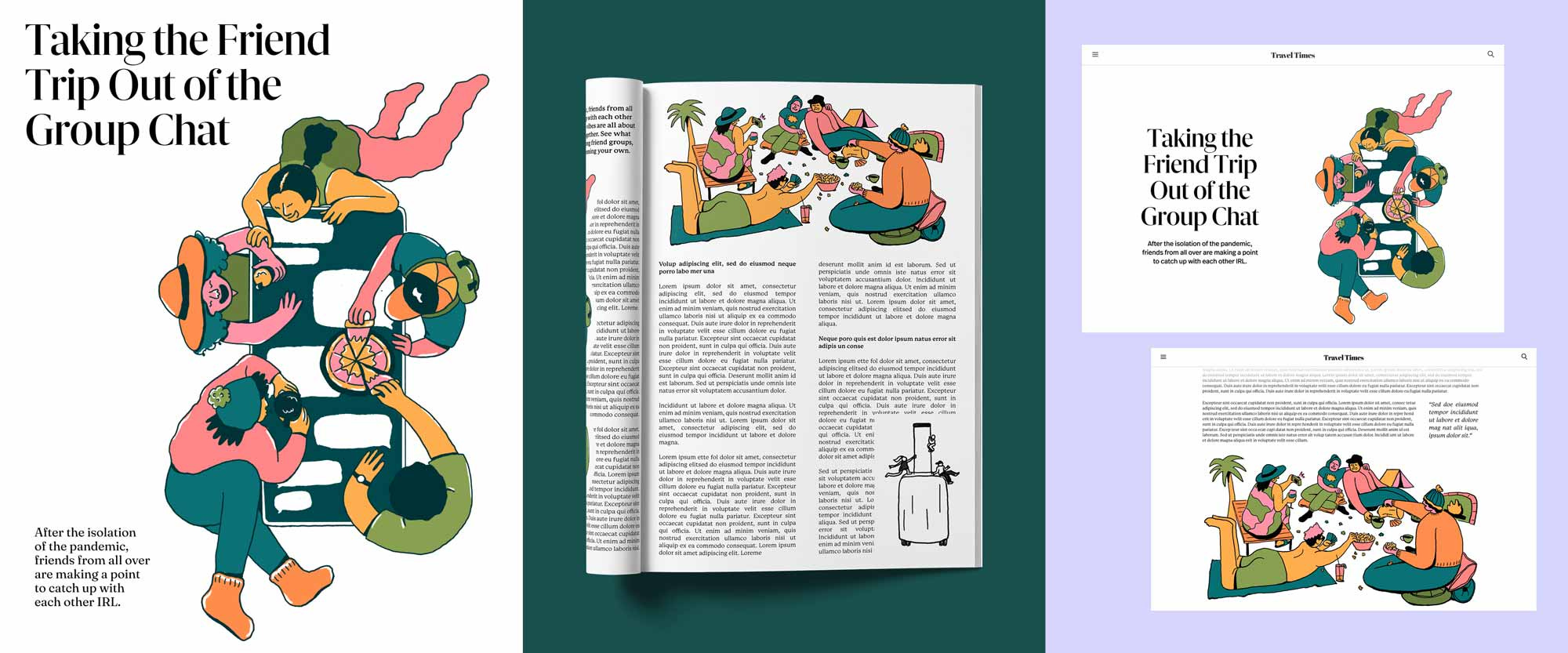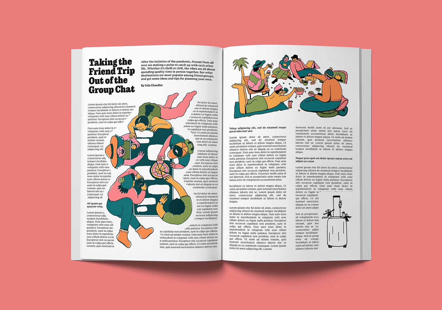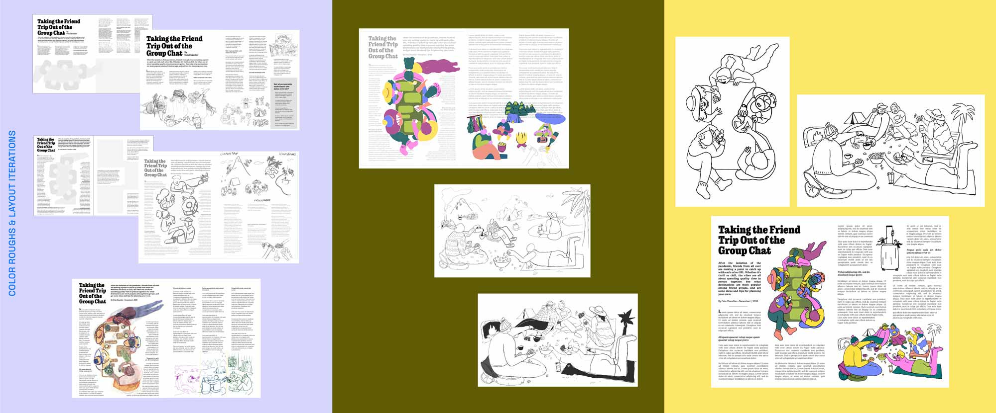 Inspired by years-long convos in my friend group chat in which we try to all get together at the same time in the same place, I came up with the idea of an article titled “Taking the Friend Trip Out of the Group Chat” – something that would lend well to two pages and dynamic illustrations.